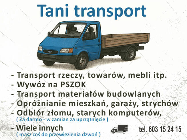 Oferuję tanie usługi transportowe w szerokim zakresie tj.: - Transport towarów, mebli itp. - Wywóz odpadów i gruzu na ...